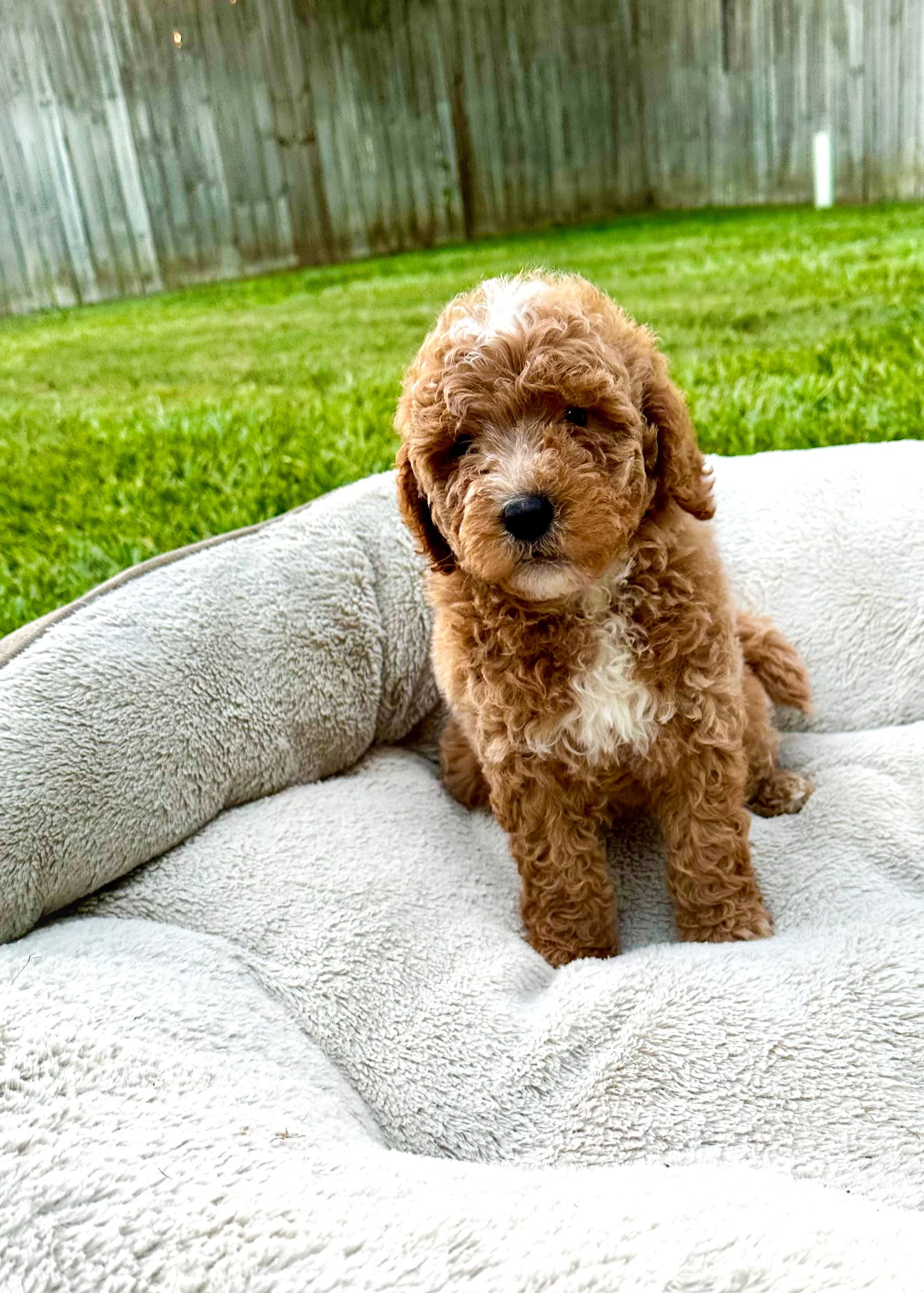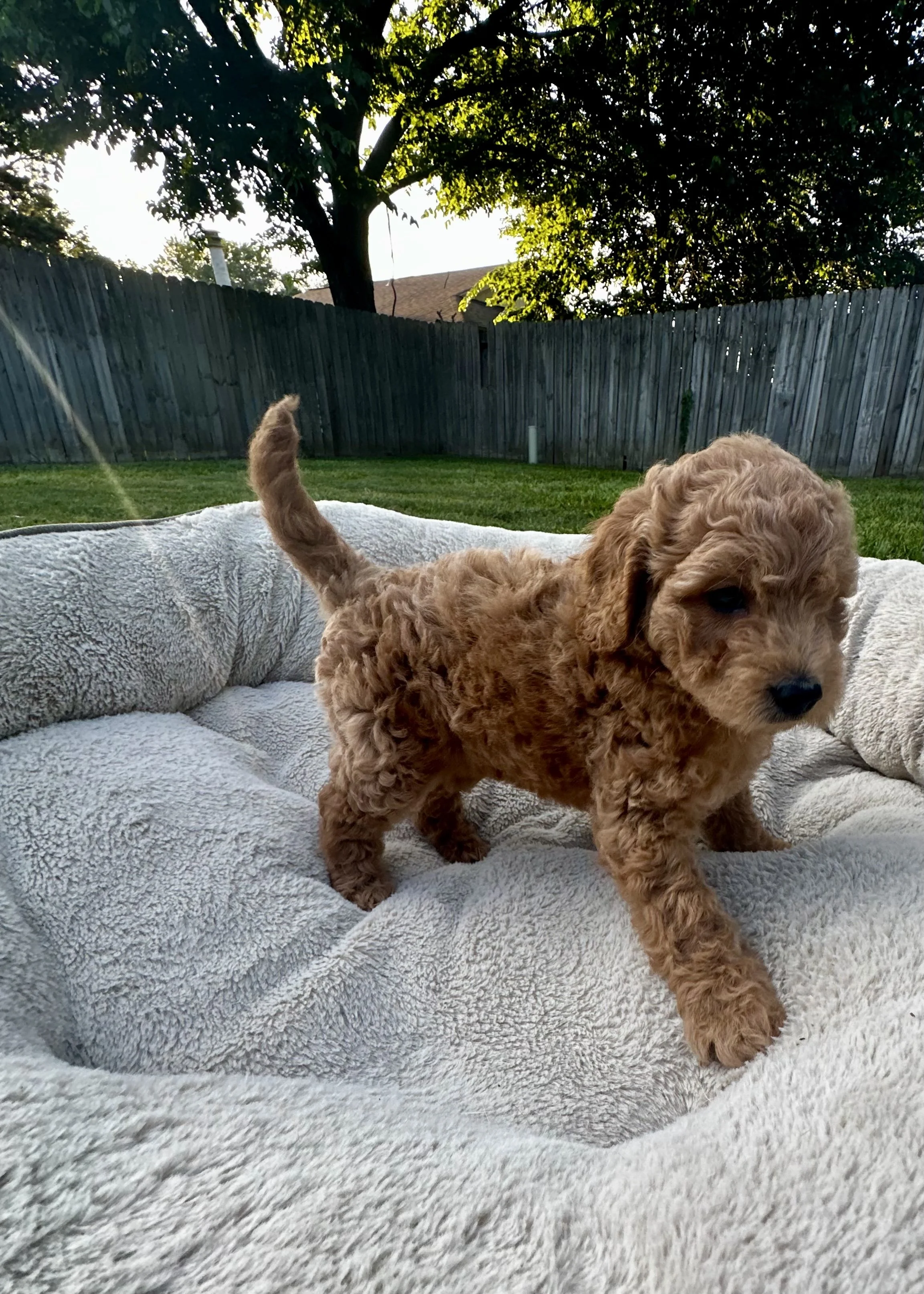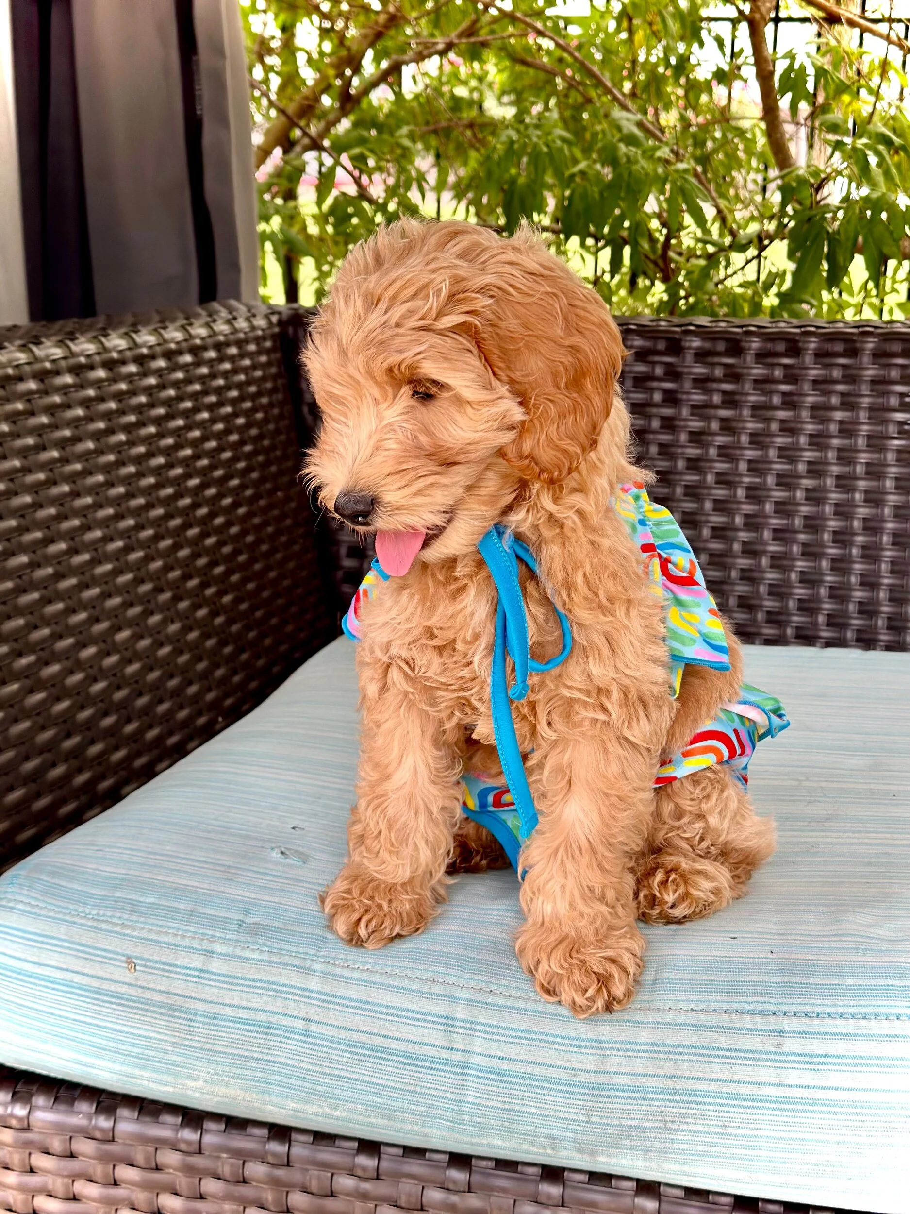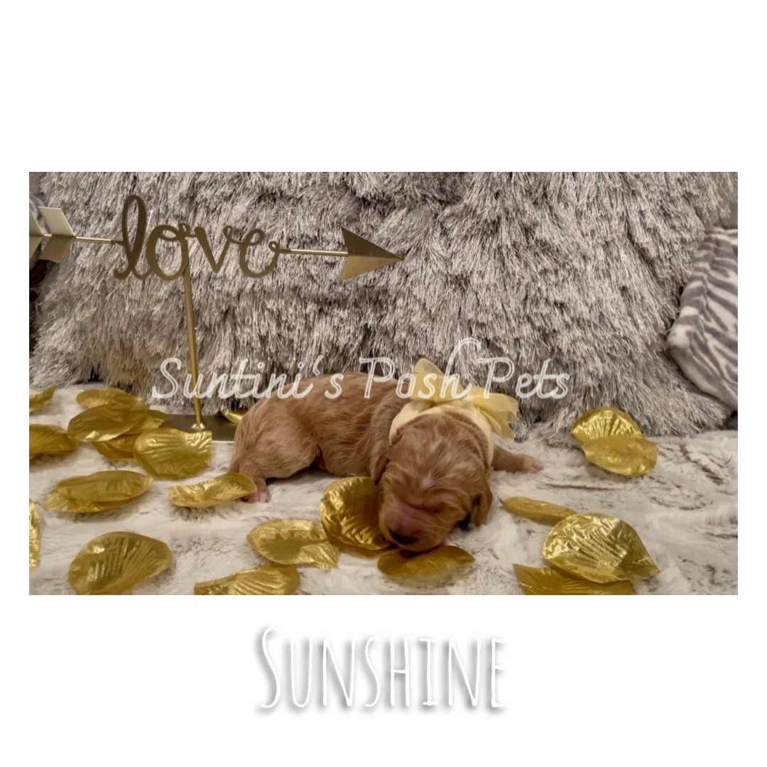 Hi, I'm Sunshine, the happiest and liveliest Goldendoodle you'll ever meet. My warm and radiant personality never fails to light up a room, and my beautiful golden coat reflects the joy of sunrays on a beautiful beach day. I love to spread joy and remind everyone that life is too short to be anything but happy. My playful and exuberant nature will bring a smile to your face, and my loyalty and compassion will make me your best friend. If you're looking for a Goldendoodle who embodies happiness, love, and endless energy, look no further than Sunshine.