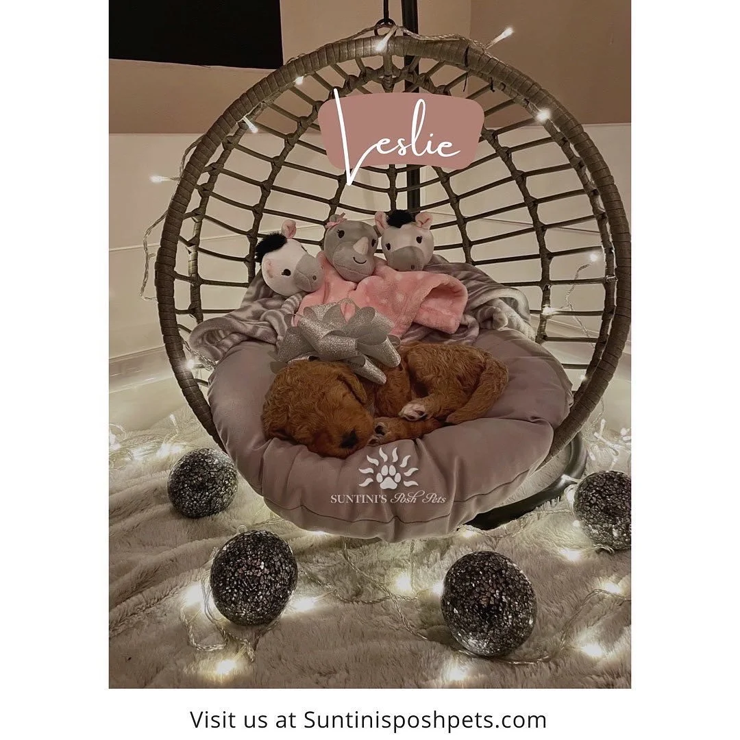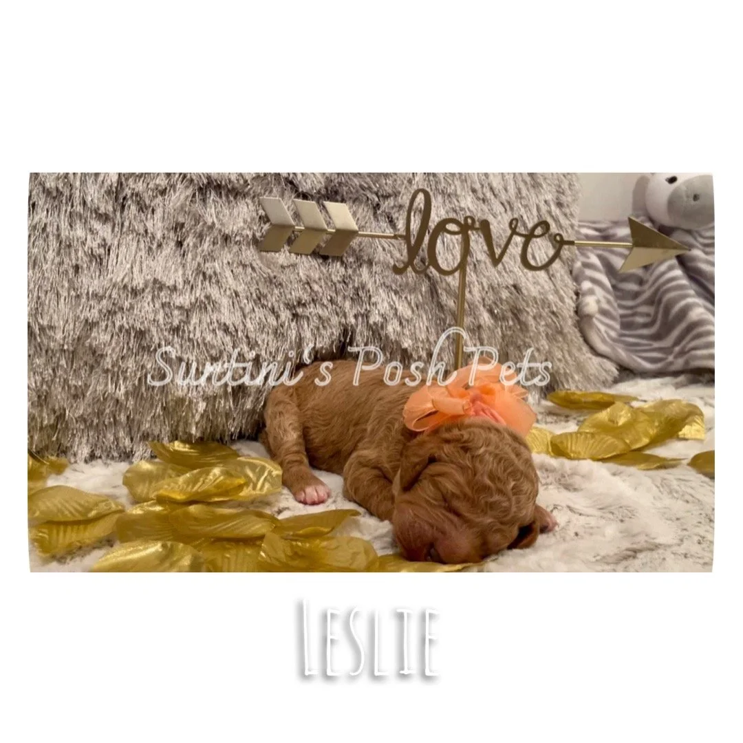 Hey there! I'm Leslie, and let me tell you, I'm the fluffiest, teddy bear Goldendoodle you'll ever meet. With my luscious, curly fur and irresistible charm, it's hard not to fall head over paws for me. From the moment I came bounding into this world, I knew I was destined to be a star. I absolutely crave being the center of attention, and I'm not afraid to demand it from my hoomans and even my adorable littermates. Trust me when I say that I steal the spotlight wherever I go!